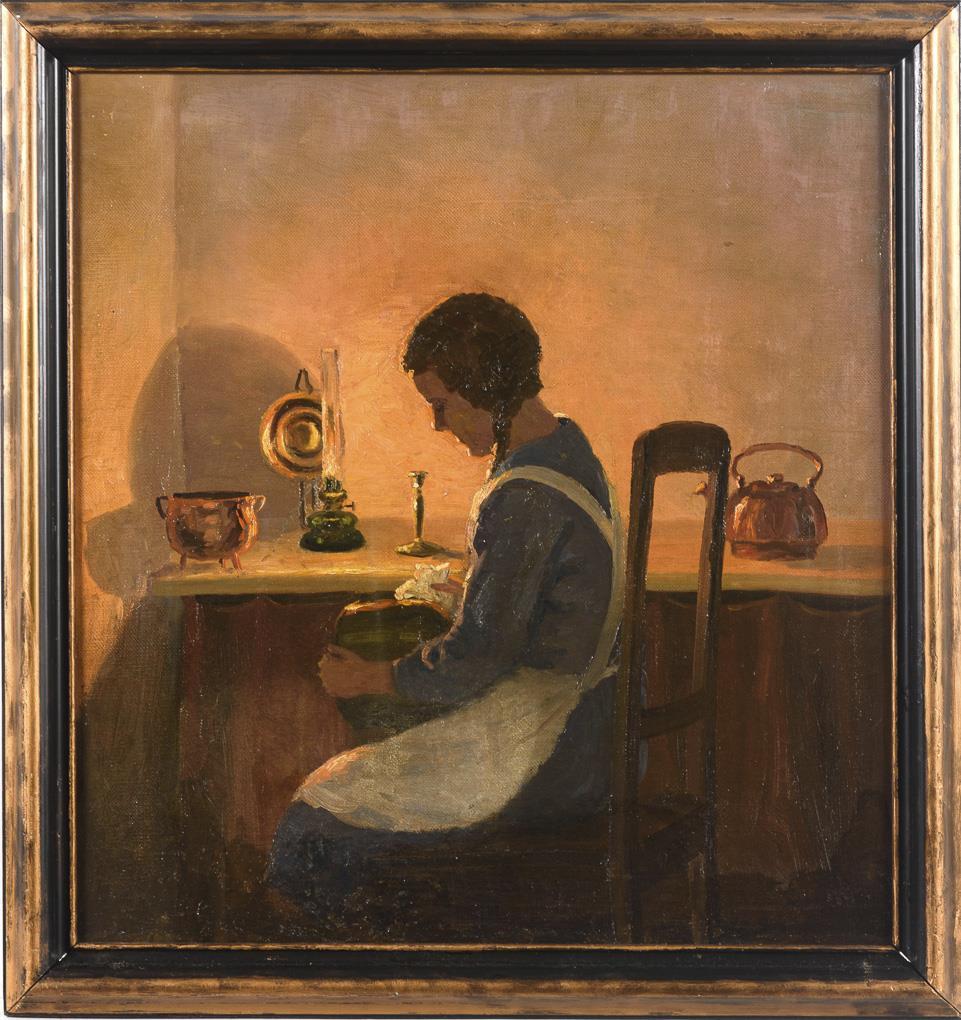 Das Mädchen bei der Arbeit im Kerzenschein am Tisch. Altersspuren.