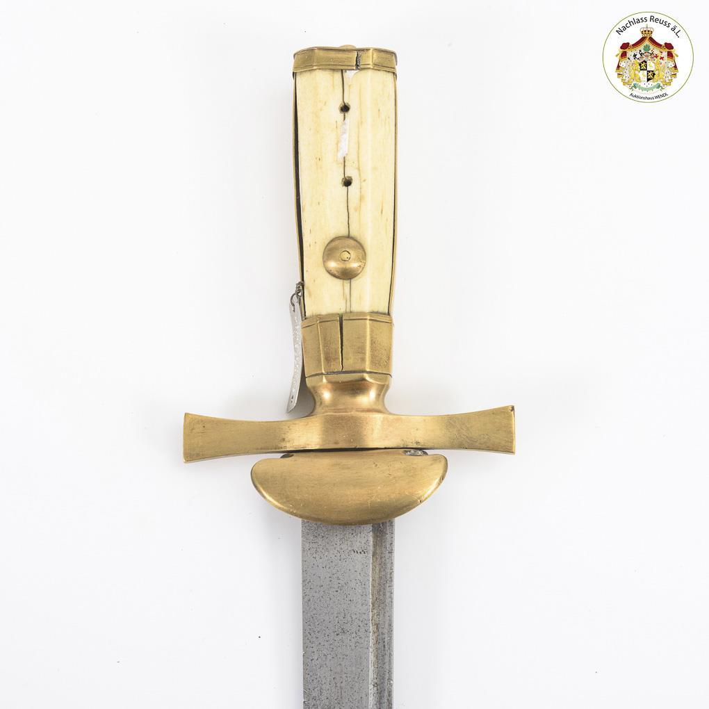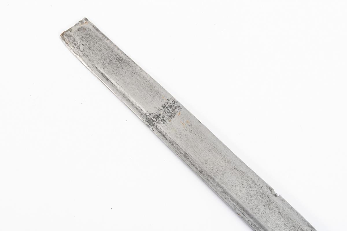 Einschneidige Klinge mit abgebrochener Spitze. Griff und dessen Messingfassung gerissen, Nieten fehlen teils. Verbindung locker.