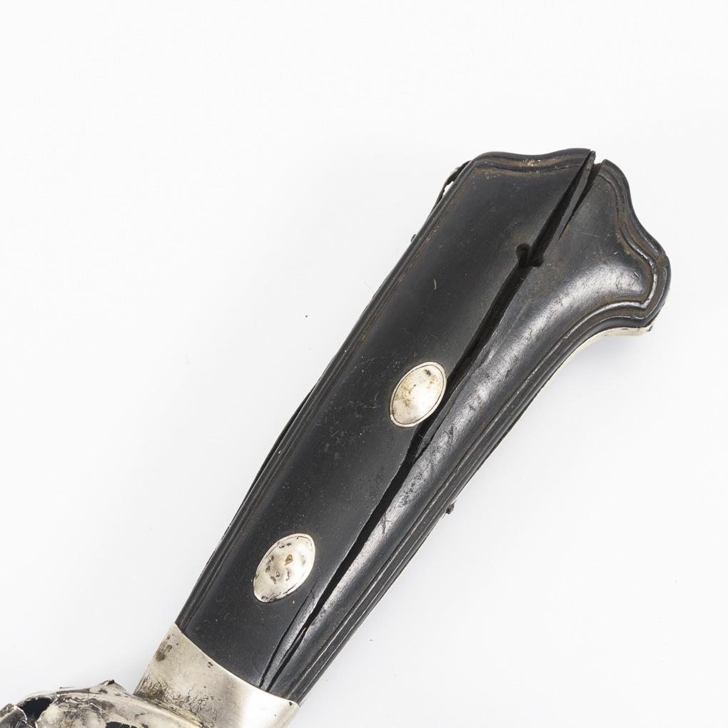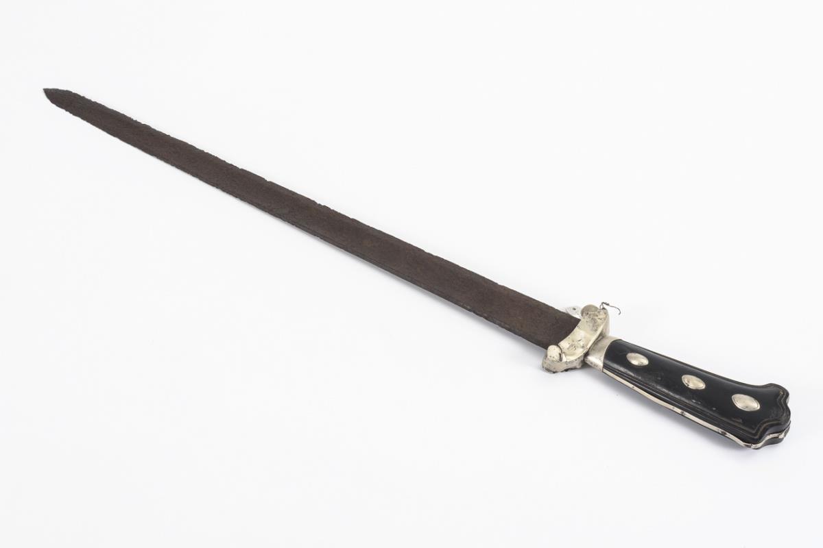 Defektes Jagdschwert mit schwarzem Horngriff.