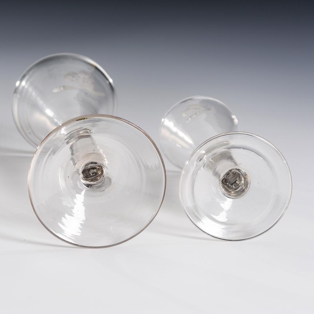 Farbloses, graviertes Glas. H 10,5 und 14,5 cm.