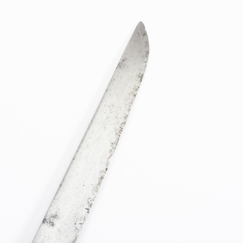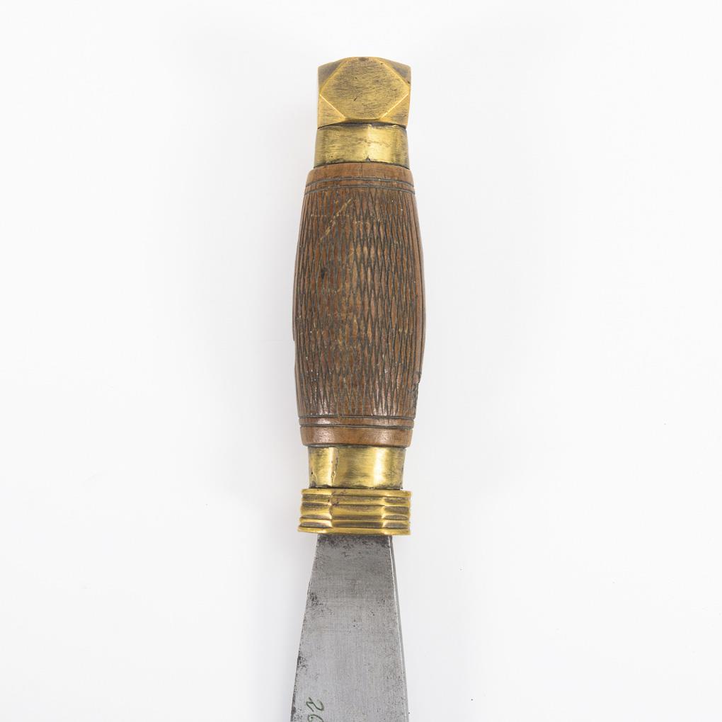 Gerade, einschneidige Klinge schartig. Holzgriff mit Rautenmuster und massive Messingfassung mit diamantartigem Knauf.