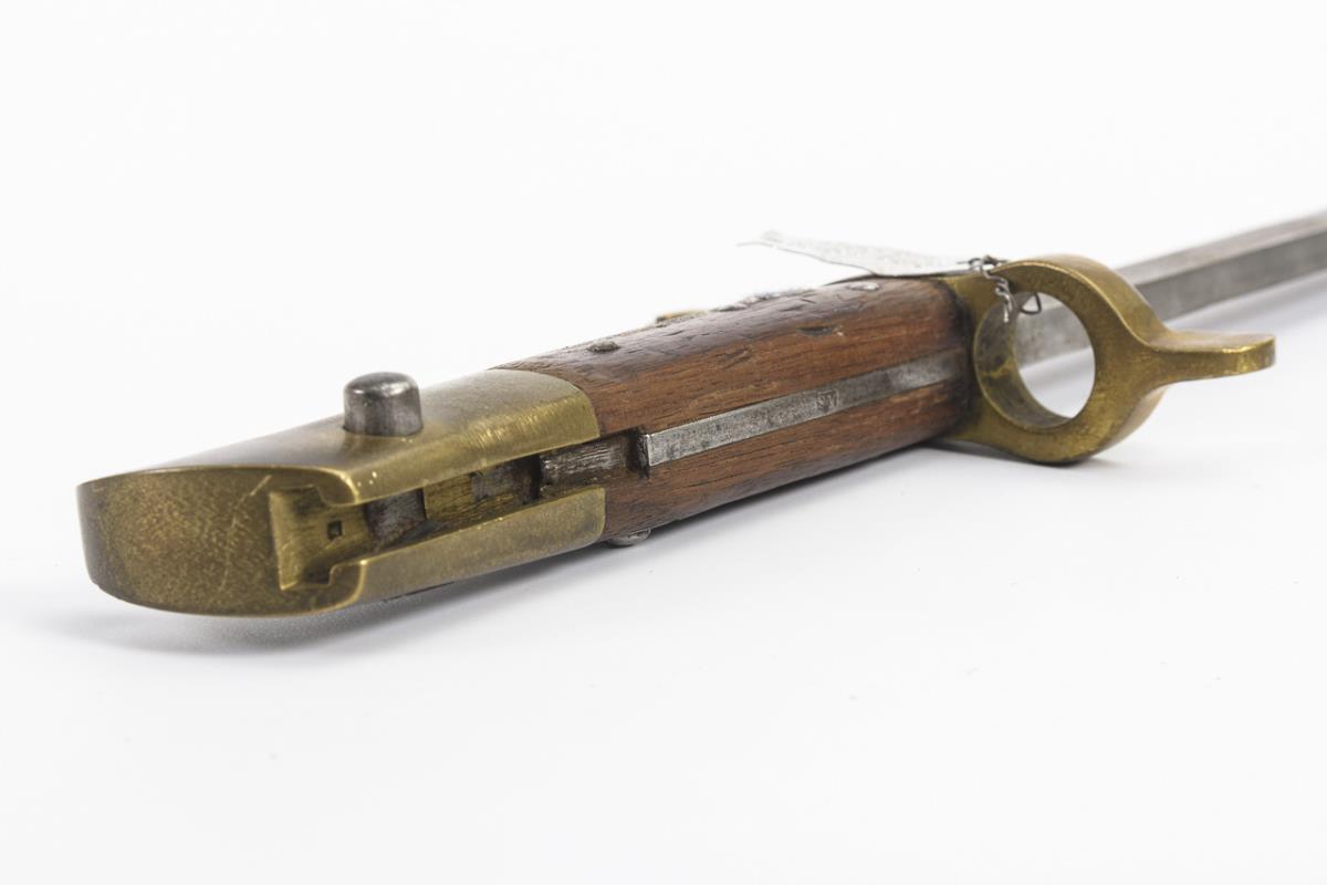 Jataganklinge mit breiter Kehlung, nur bekrönte Prüfmarke und "31815". Holzgriff und Messingfassung, Mündungsring sehr dick. Wohl dazugehörige Lederscheide mit Knopflasche. Altersgemäß guter Zustand.