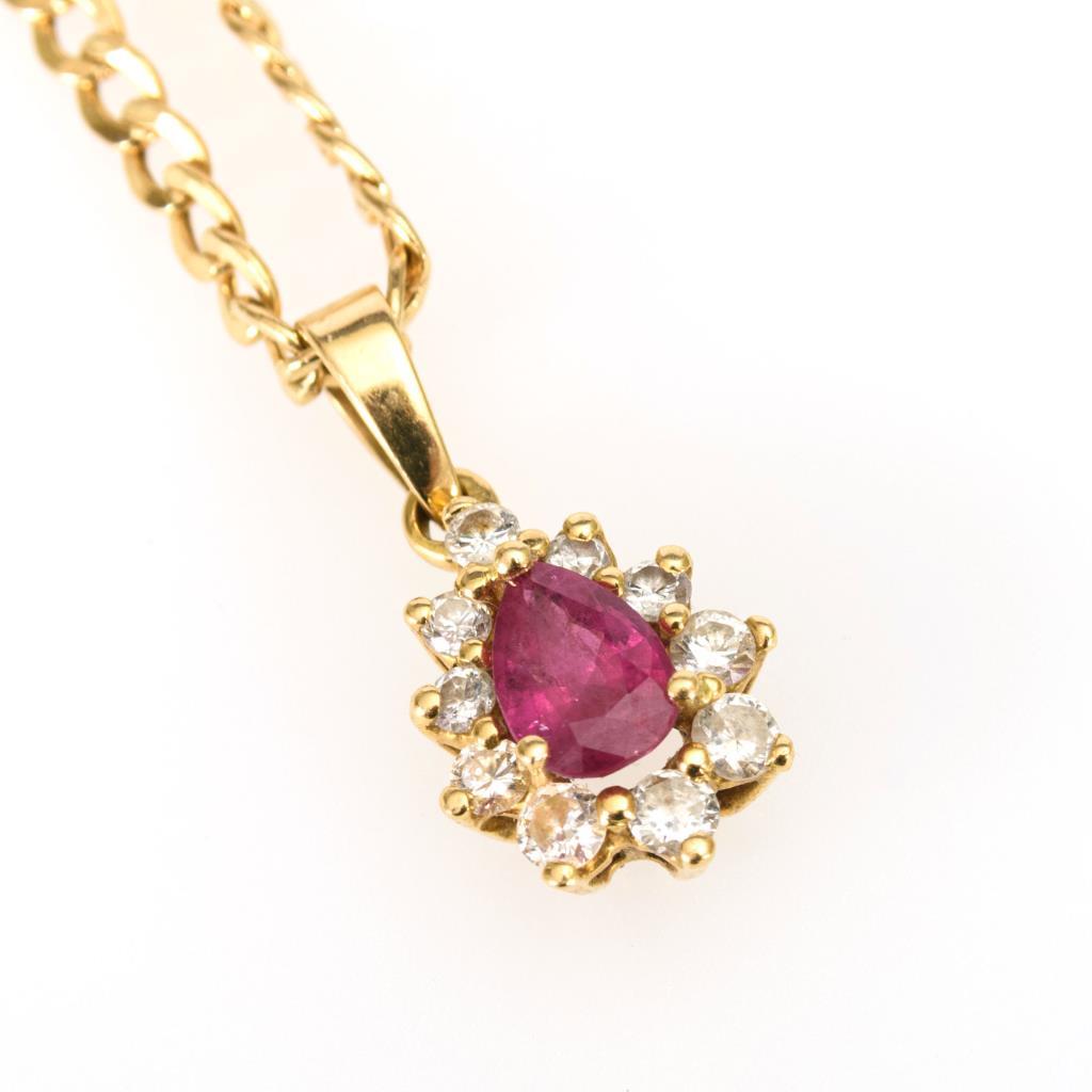 Tropfenförmiger Rubin, umgeben von 10 kleinen Brillanten. Flache Panzerkette mit Ringfederschließe.
