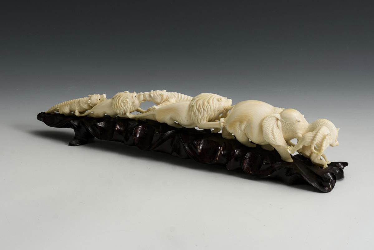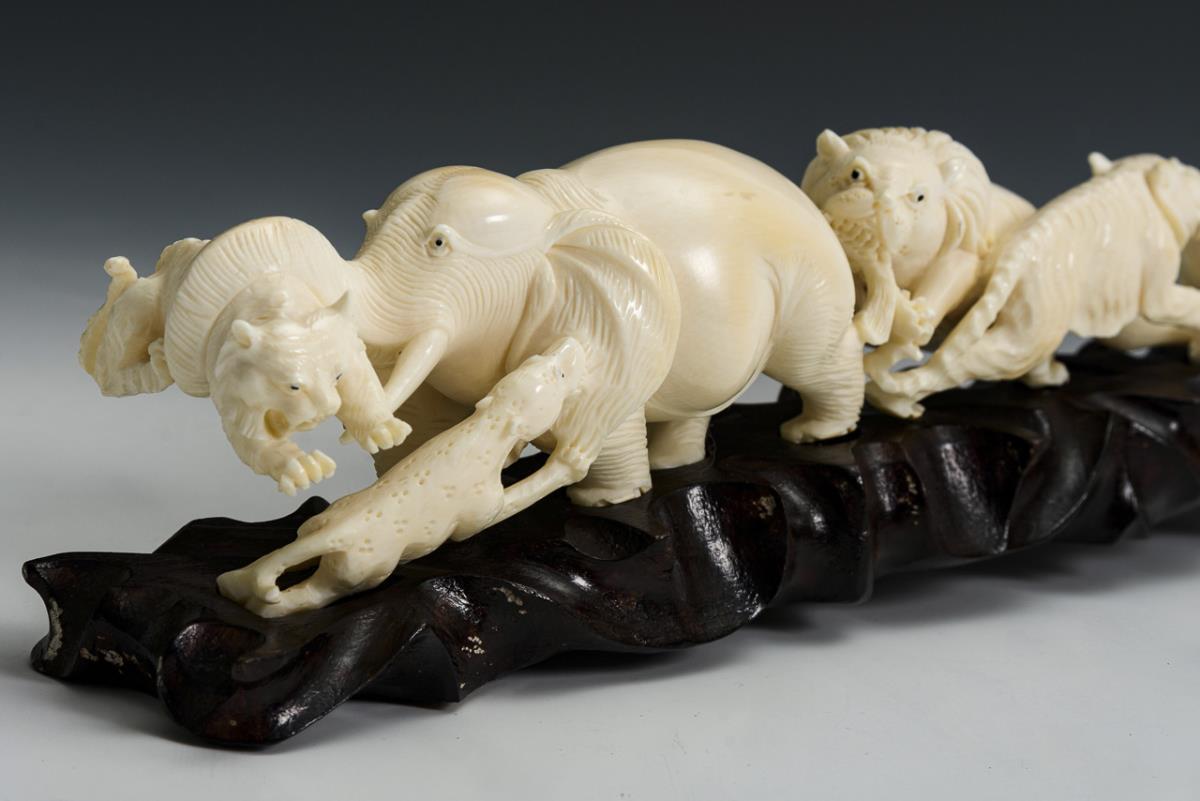 Kampf zwischen Elefant, Löwen, Tigern und Leopard in stark dynamischer Schnitzerei, auf Holzsockel. Zwei Chips an Schwanzspitzen, kleiner Trockenriss auf Unterseite.