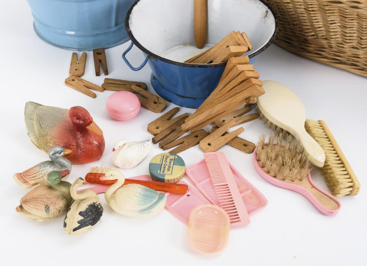 Ovale Wanne mit Messinghahn, auf Ständer mit Zwischenablage. Dazu 2 runde Henkelschüsseln, 1 Eimer, 3 Enten und 3 Schwäne aus Celluloid sowie einige Bürsten und Waschutensilien, dazu geflochtener Wäschekorb mit Kleidern und Klammern. Altersspuren, kleine Roststellen.