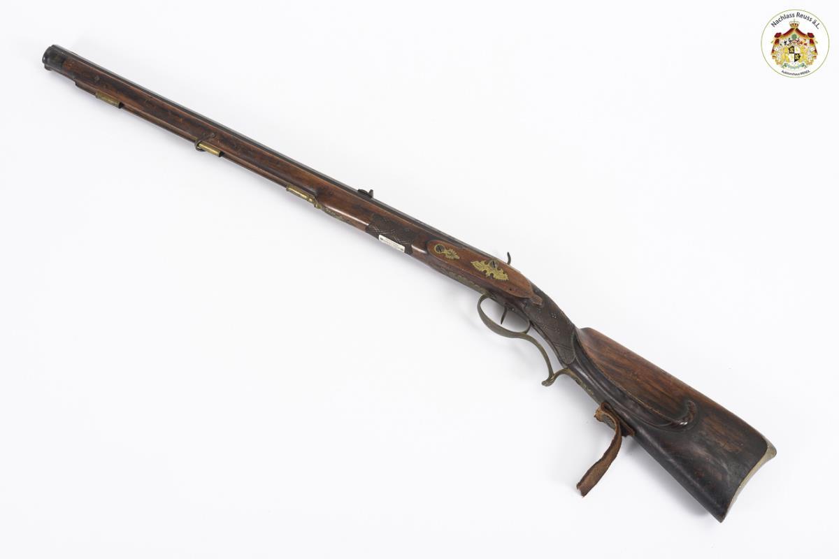 Achtkantiger, gezogener Lauf mit Kaliber 16 mm, mit "Nr. 2" markiert. Verzierte Schlossplatte gemarkt "Keiner Dessau", Gegenplatte als florales Messingstück ausgeführt. Eingelegtes Wappenmonogramm am verzierten Griff verputzt. Schaft mit Fach und Kolben mit weiteren sorgfältigen Verzierungen. Schaftspitze aus Horn. Reste des Originalgurtes. Ladestock fehlt, altersgemäß schöner Erhaltungszustand.