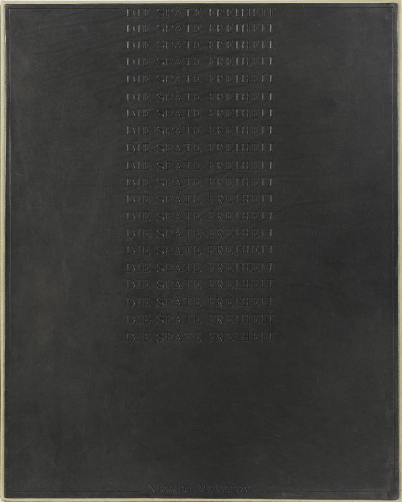 Vollständige, originale Kassetten-Mappe mit 10 Radierungen und 1 Titelblatt zu einem Bilderzyklus von Nikolai Makarov - "Die in gedämpften Farben oder in der Grisaille-Technik gemalten Bilder des zwischen 1984 und 1987 geschaffenen Zyklus „Die späte Freiheit“ zeigen ältere Menschen, die Nikolai Makarov allein oder in Gruppen dargestellt [sic!]. Ihre resignative Haltung und ihre Mimik vermitteln eine Ahnung von Ausweglosigkeit und ergeben ertragener Bedrängnis. Vor diffus monochrom angelegtem Hintergrund hockend, frontal oder im Profil ohne jedes Beiwerk portraitiert oder symbolträchtig miteinander in einem Boot vereint, vermitteln die greisen Individuen der „Späten Freiheit“ eine metaphorische Sicht auf die persönlichen Krisen einer um ihr Leben betrogenen Generation, die ihre Freiheit nicht mehr auszukosten imstande sein wird, sich selbst befragt und konstatiert, dass sie mit dem Leben eine Rechnung offen hat." (Zitat gesehen auf http://www.nikolai-makarov.de/gallery/spaete-freiheit.html).