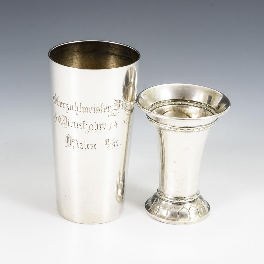 1x kleiner ADAC-Becher "Gauwertungsfahrten 1930. Gau 10a". / 1x hoher konischer Militaria-Becher des 6. Thüringischen Infanterie-Regiments mit Widmung "Oberzahlmeister Binn, 40 Dienstjahre 1. 4. 03, Offiziere III/95.", verso bekrönte Monogrammgravur Georg II. Innen vergoldet. Minimal gedellt.