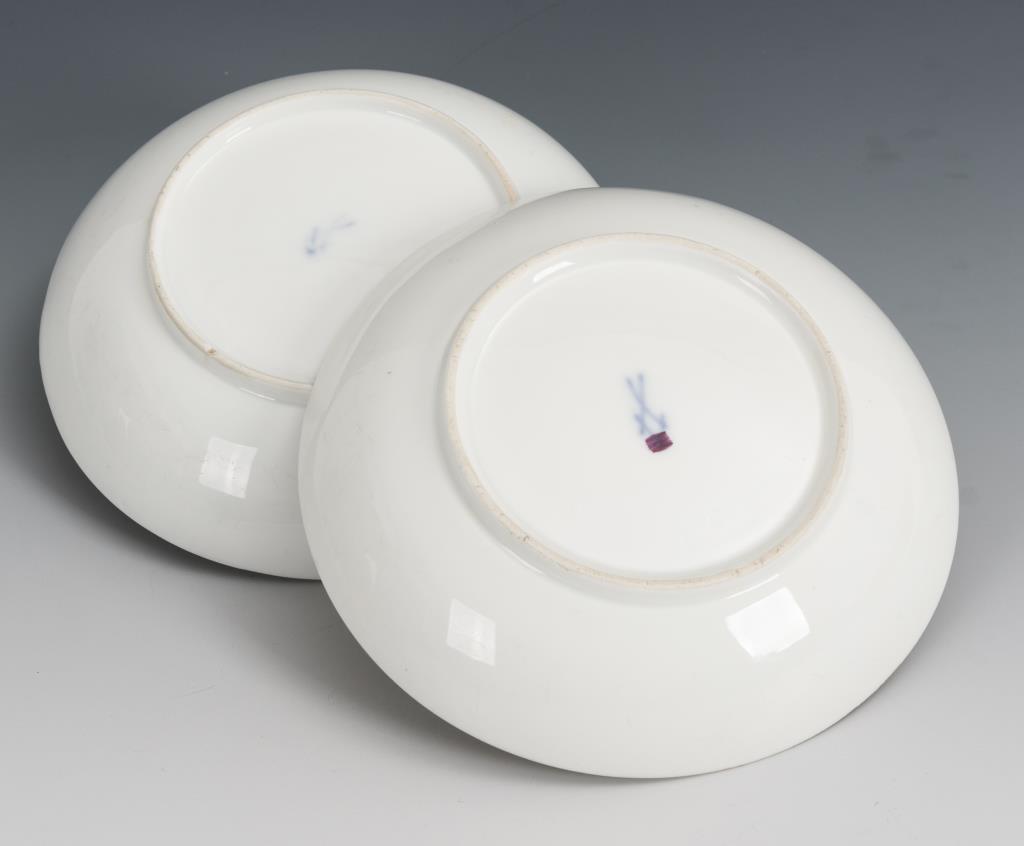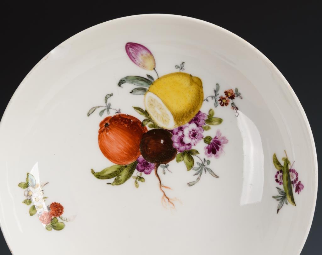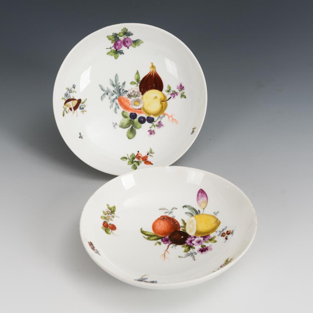 Untertassen mit Fruchtbuketts und Streublümchen. Etwas berieben, 1x mit Randchip.