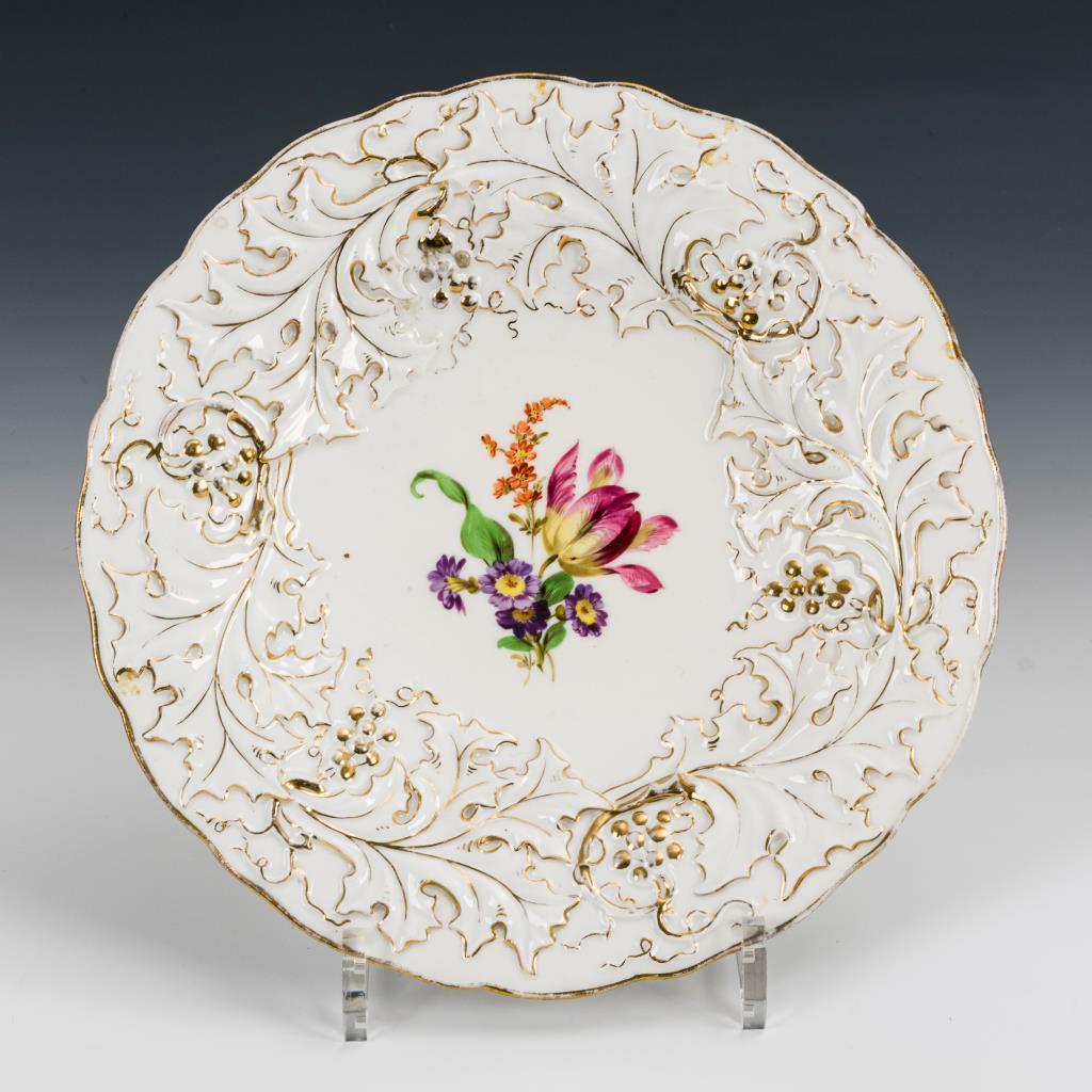 Teller mit Lorbeerrelief und einem Blumenbukett im Spiegel. Partieller Goldabrieb.