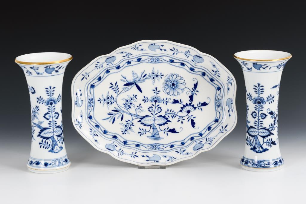 Unterglasurblaue Malerei, teils goldstaffiert.Ovaltablett L 35,5 cm, 2 Flötenvasen H 24,5 cm.