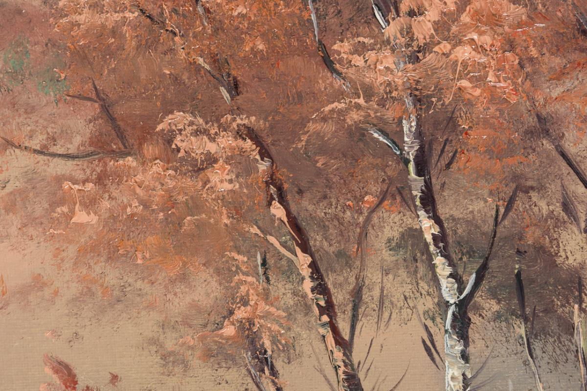 Herbstliche Bäume im Morgenrot an einem gemächlich fließenden Fluss. Eine kleine restaurierte Stelle mit Hinterklebung.