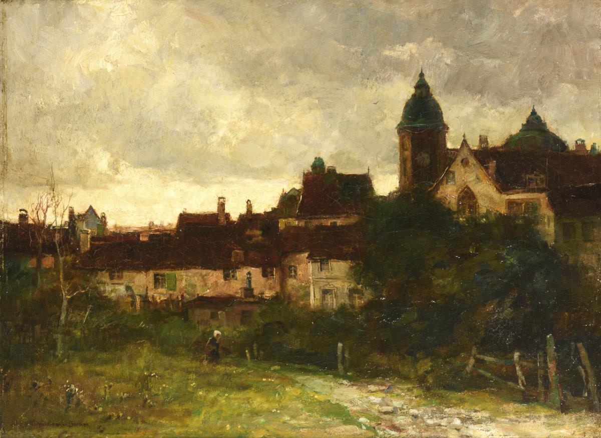 Staffagefigur am Stadtrand vor den dicht stehenden Häusern. Leinwand doubliert.