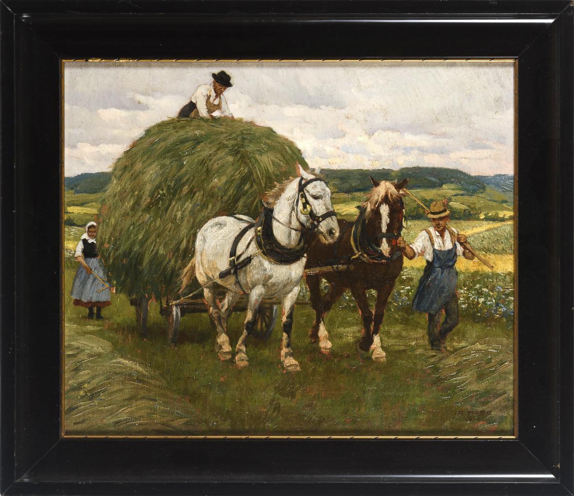 Die Bauern mit dem voll beladenen Heuwagen auf dem Heimweg.