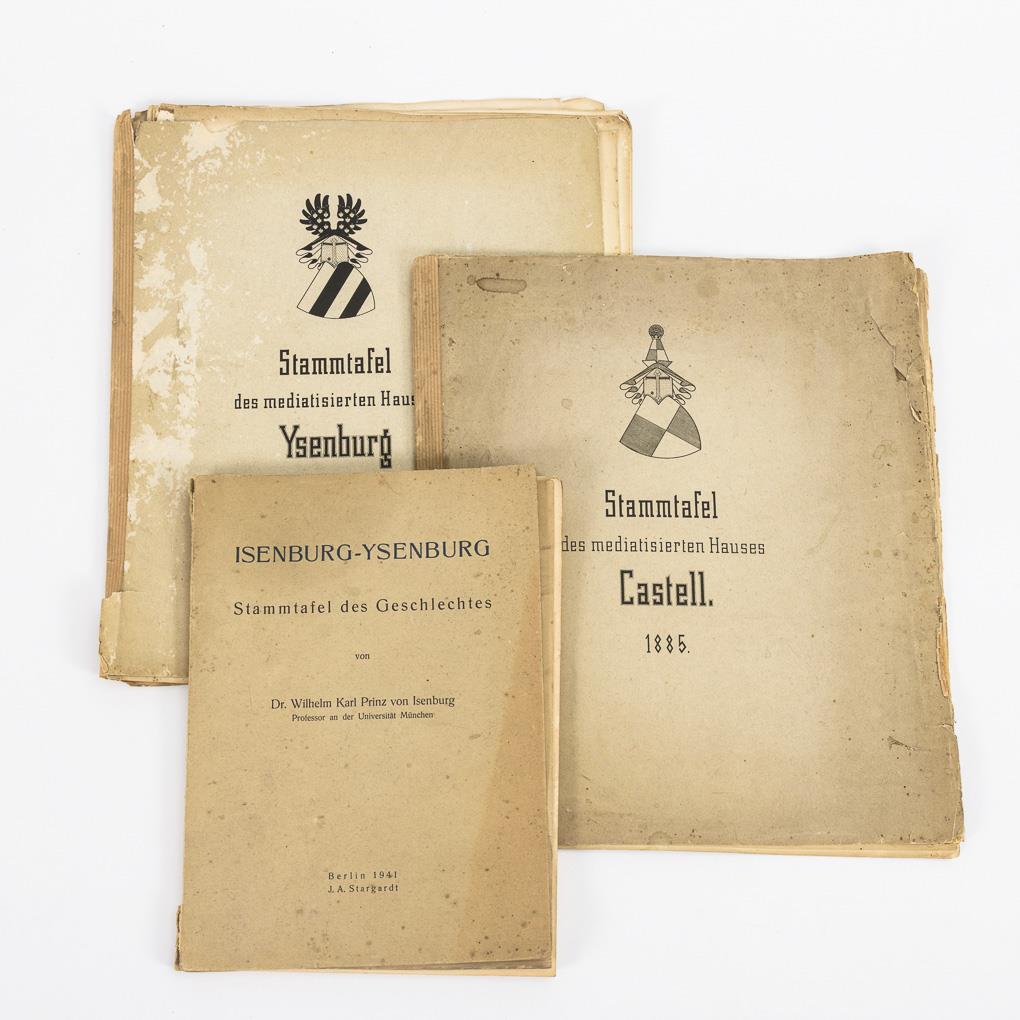 Wilhelm Karl Prinz von Isenburg: "Isenburg-Ysenburg - Stammtafel des Geschlechtes", Berlin 1941, ohne Seitenzahl. / "Stammtafel des mediatisierten Hauses Castell 1885", 6 großformatige Tafeln. / "Stammtafel des mediatisierten Hauses Ysenburg 1887", 18 großformatige Tafeln. Alle Bände mit Alters- und Gebrauchsspuren, Kanten bestoßen.