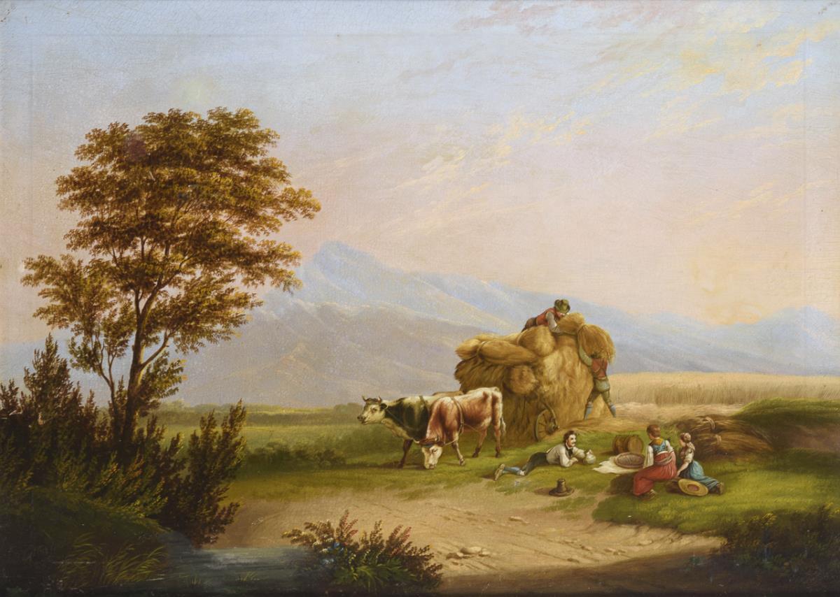 Die Bauern beim Verladen der Kornhocken und bei der Rast am Feldrand. Restauriert.