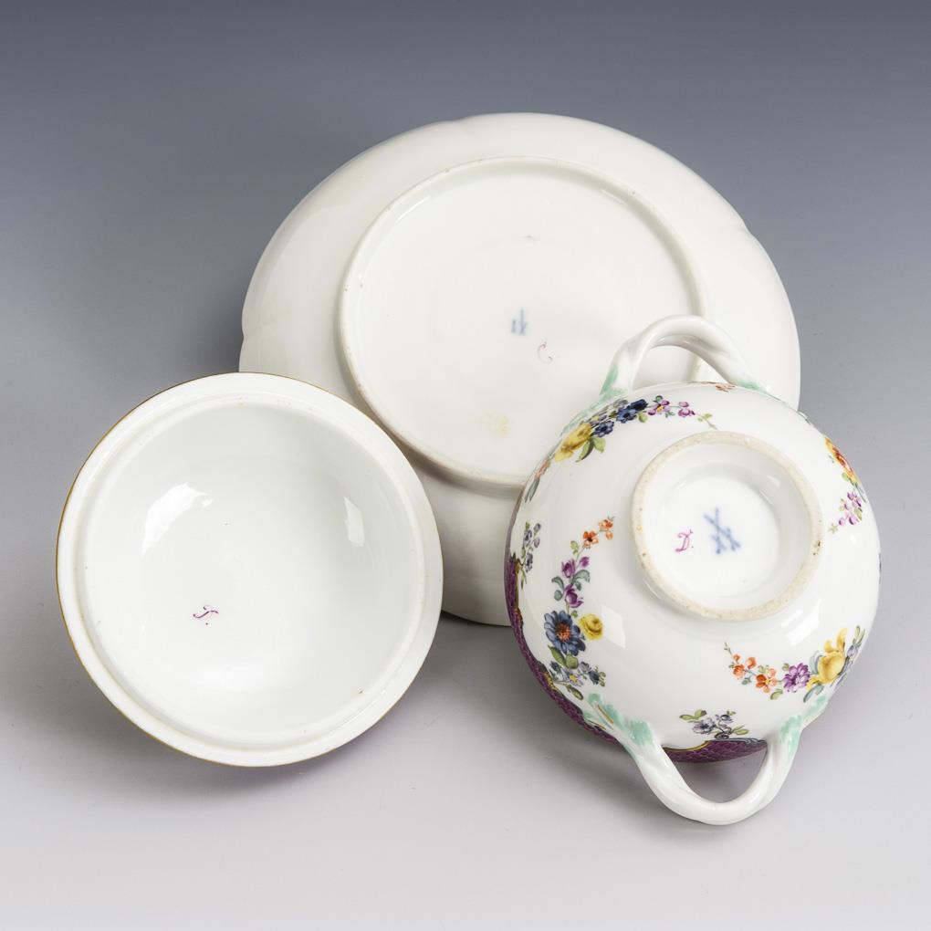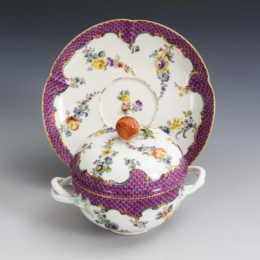 Doppelhenkeltasse mit Erdbeerknaufdeckel. Unter einer purpurfarbenen Schuppenbordüre angeordnete Blütengirlanden. Partieller Goldabrieb.