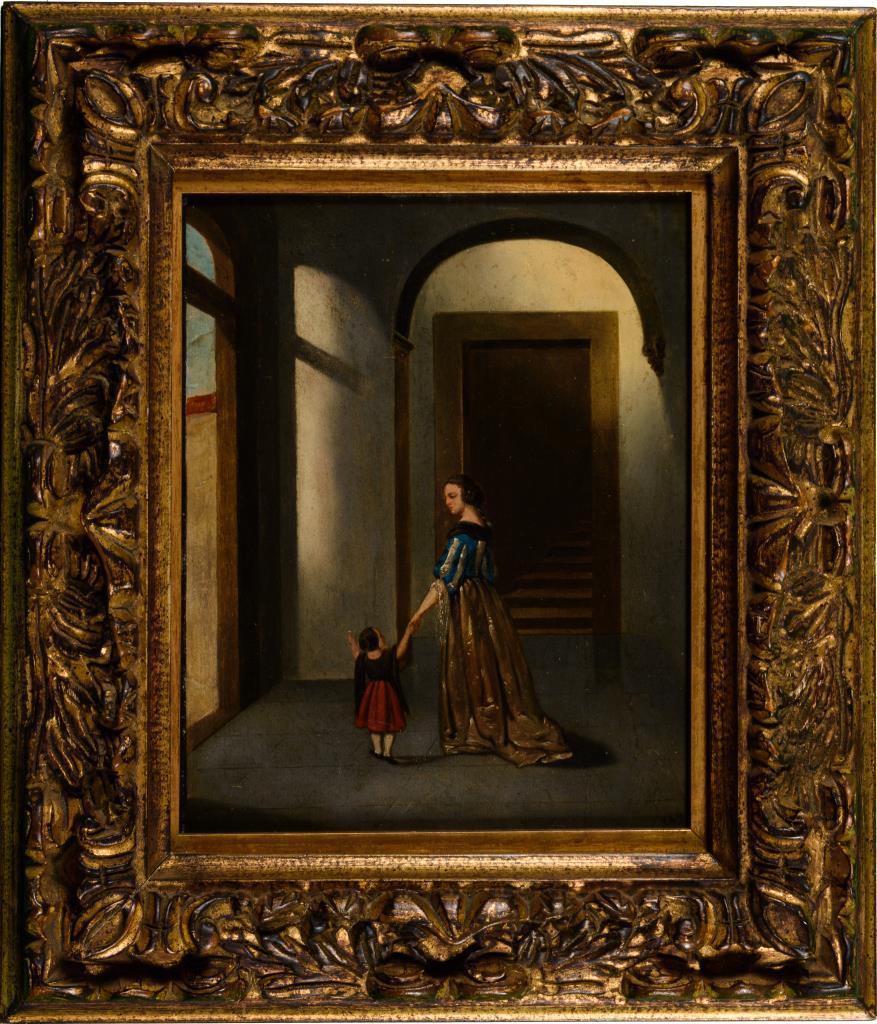 Junge Frau in historischem Gewand in gutbürgerlichem Hauseingang mit einem Kleinkind. Minimale Altersspuren.