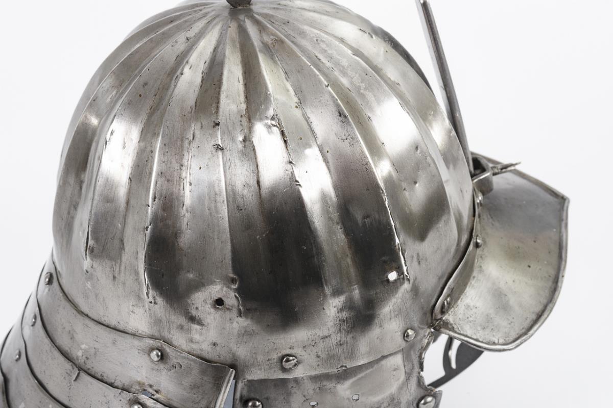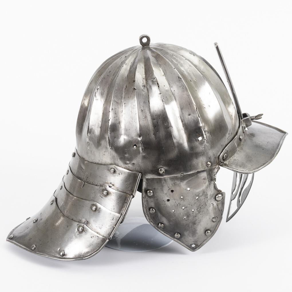 Helm (auch Pappenheimer genannt) mit Öse am oberen Ende, Nackenschild aus vier überlappenden Teilen. Verstellbarer Gesichtsschutz, der über die übliche Nasenschiene hinausgeht. Ohrenklappen aus zwei Teilen gefertigt. Einige Grate des Helms mit Rissen, die durch Alter entstanden sind. Konservatorisch behandelt, Alters- und Gebrauchsspuren.
