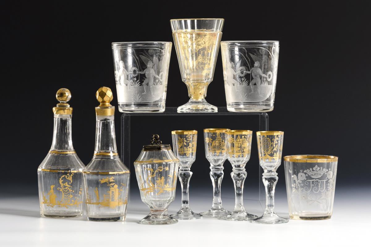 2 Karaffen (H 18,5 cm), 4 Kelchgläser (H 12,5 cm) und 1 Deckelgefäß mit vergoldeter Silbermontierung (H 12 cm) mit Goldmalerei. / 1 Zwischengoldbecher mit Figurenmotiv und Bandelwerk (H 13,5 cm). / 1 Becher mit dem Monogramm "FJT" im gravierten Blütenkranz (H 8,5 cm). / 2 Zylinderbecher mit gravierten Floral- und Puttenmotiven (H 10,5 cm). Partieller Goldabrieb, 1x Bestoßung am Stand und 1 Karaffenrand.