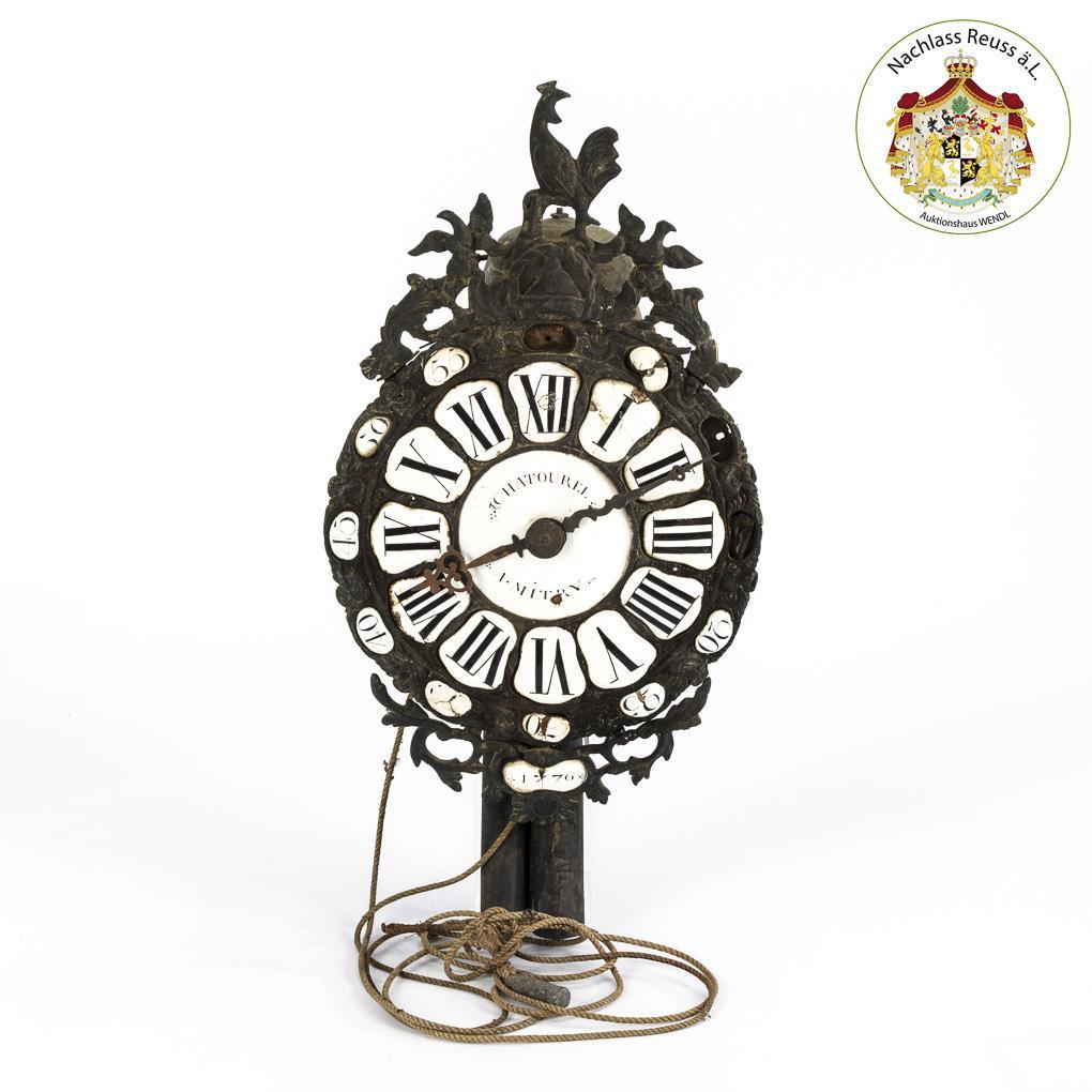Räderwerk mit Viertelstundenschlag auf 2 Glocken, läuft nicht. Weiße Emailreserven mit römischen Stunden und arabischen Minuten, 2 Eisenzeiger, bezeichnet "Chatourel à Mitry", datiert "1776".