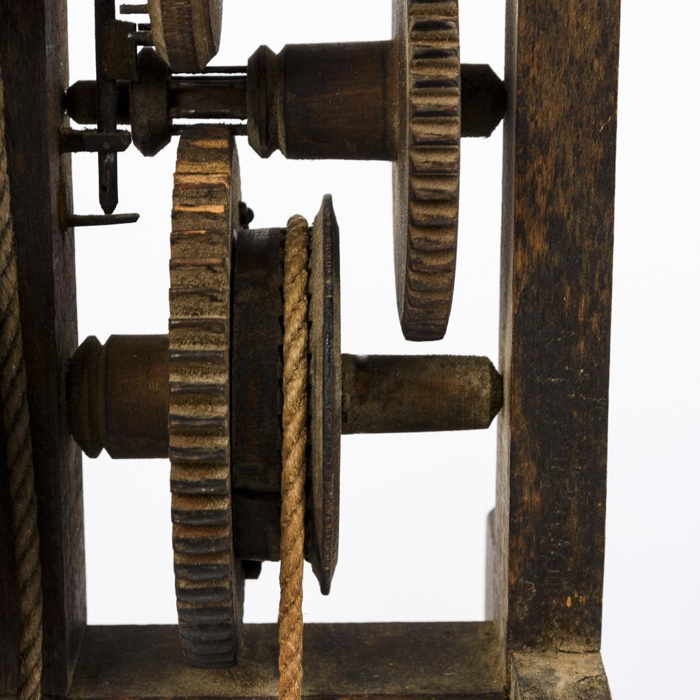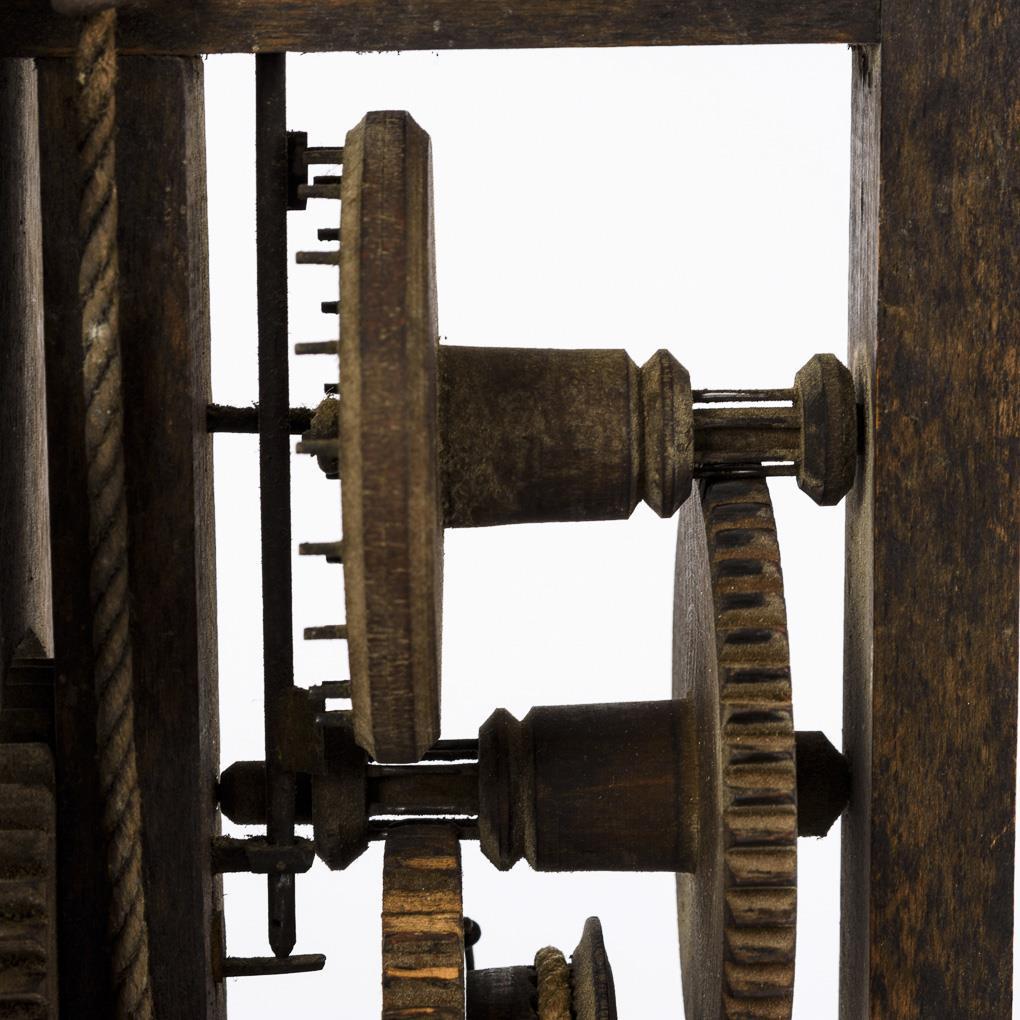 Holzräderwerk mit Foliot (Waagbalken, ohne Gewichte) und Gewichtsantrieb mit Holz- und Steingewicht, Funktion nicht geprüft.