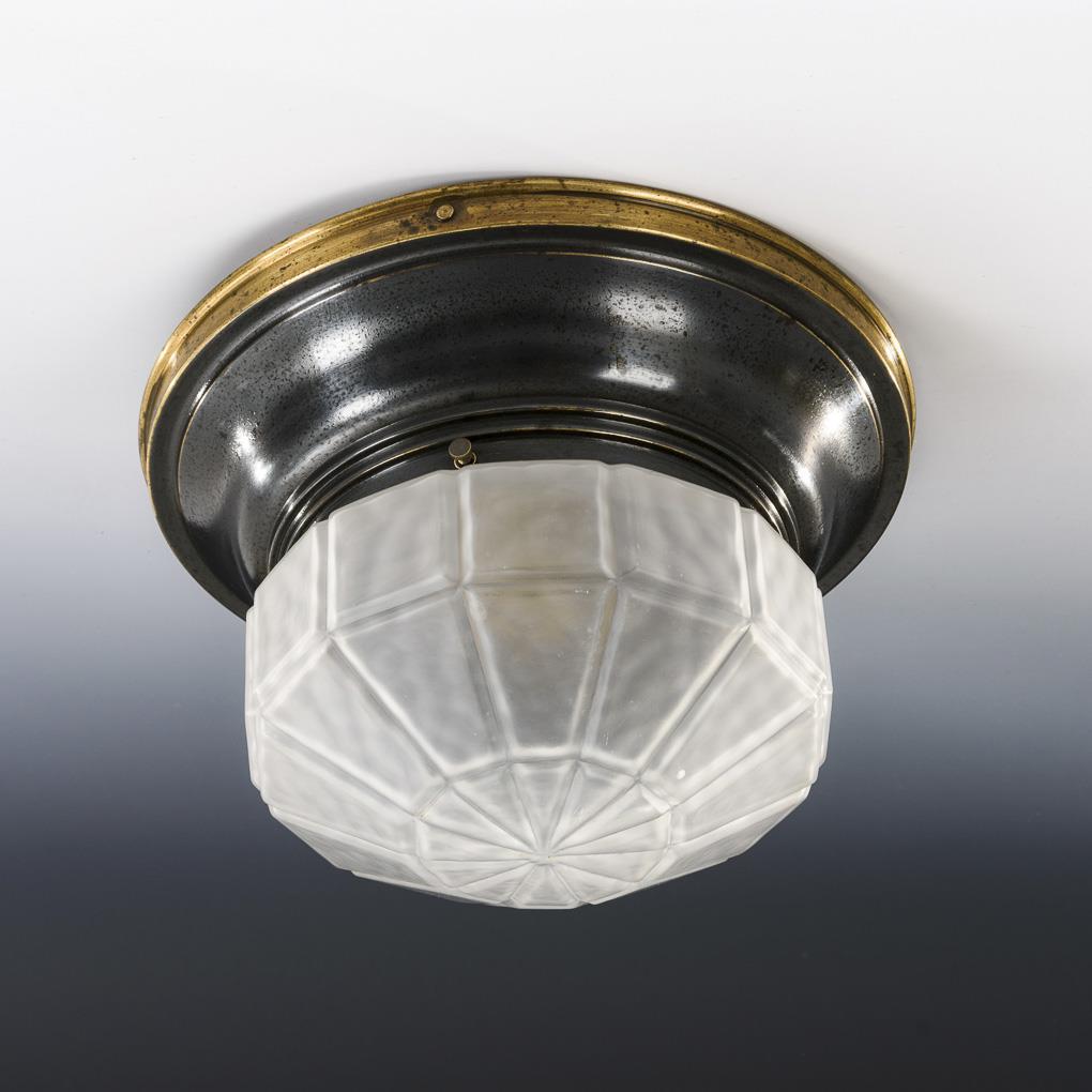 Dunkel patiniertes Messingblech, farbloses, kassettenoptisch geblasenes und mattiertes Glas. Ø 25 cm.