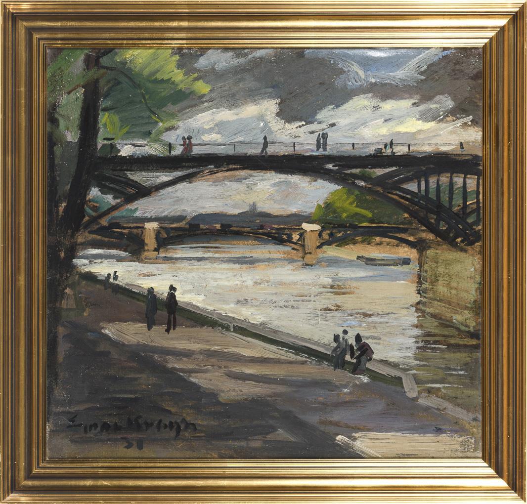 Die Brücke über der Seine mit Staffagefiguren auf der Promenade.