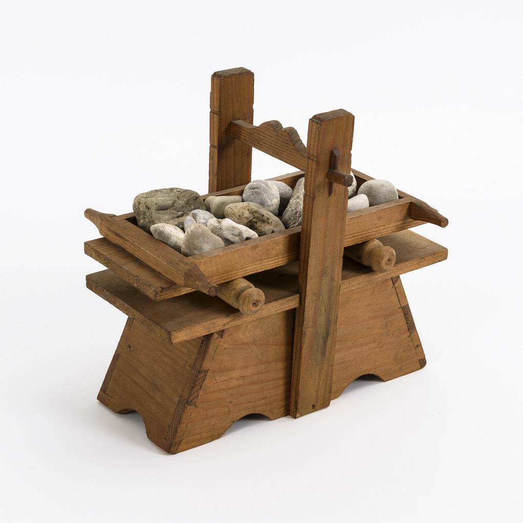 Mangel mit 2 Holzrollen und Kieselsteinen zum Beschweren.