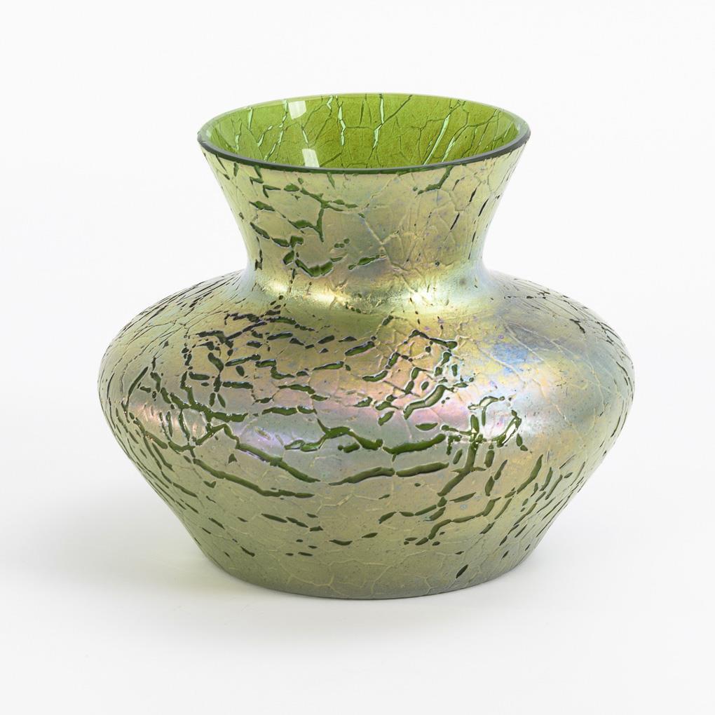 Grünes, silbergelb überfangenes Glas mit rissiger Oberflächenstruktur, irisiert. H 14 cm.