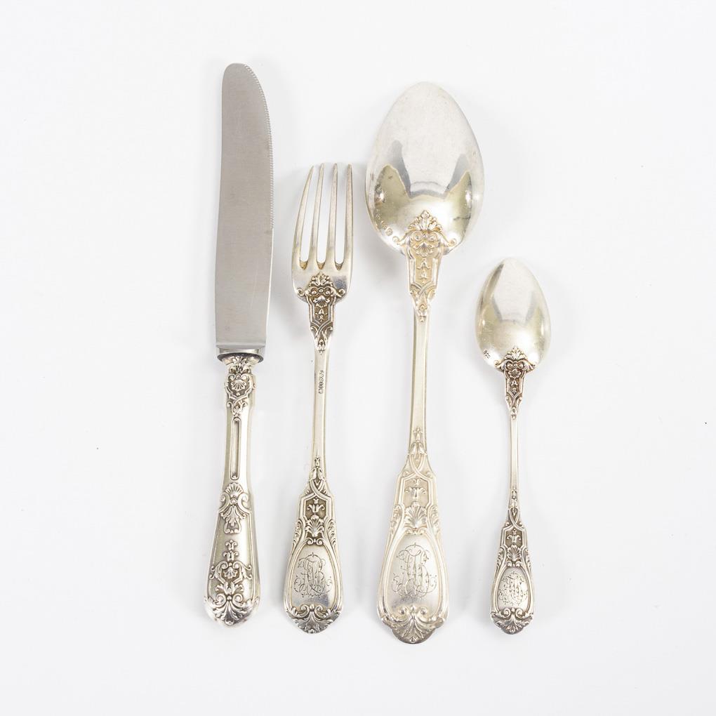 45 Teile: 12 Messer, 12 Suppenlöffel, 11 Gabeln, 10 Kaffeelöffel. Je beidseitig barock reliefiert (Dekor-Nr. 851), unterseitig verschlungene Monogrammgravur.