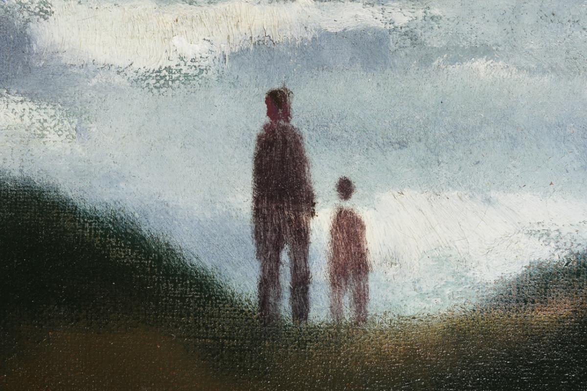 Staffagefiguren auf den bewachsenen Dünen mit Blick über die hohe Brandung.