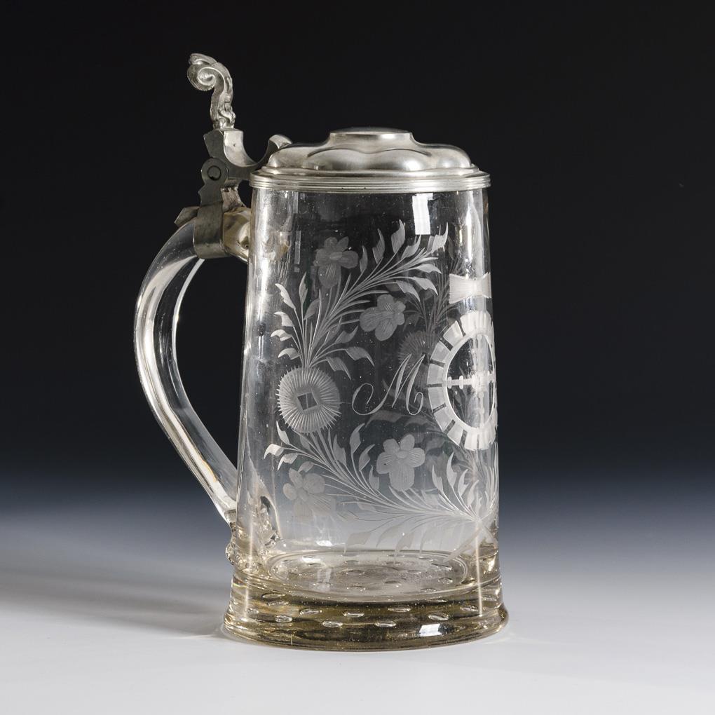 Konischer Krug mit eingeschmolzenen Luftblasen im Boden, Bandhenkel und Zinndeckel, Abriss. Schauseitig das von Blütenstängeln gerahmte Zunftzeichen der Müller mit den Buchstaben "M M".