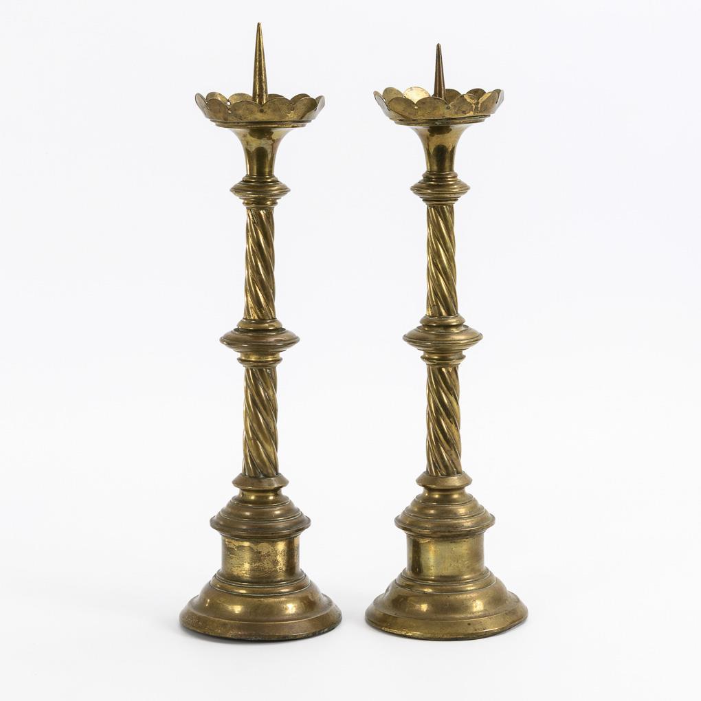 Im Stil der Gotik gestaltete Leuchter mit Wirteln am tordierten Schaft. Einige Alters-/Gebrauchsspuren.