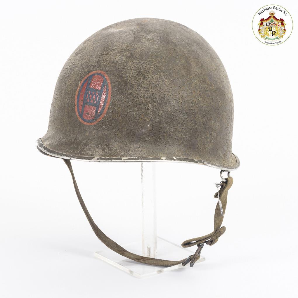 Feldgrau lackierte Glocke mit Randeinfassung und Webgurt-Kinnriemen; vorn wohl gedrucktes rot-schwarzes Symbol (Truppengattung?). Feldgrau überstichener Kunststoff-Innenhelm mit Kinnriemen und Schweißband aus Leder sowie verspannte Webgurtbändern; im Scheitel Herstellermarke "F 21"; vorn Reste wohl des gleichen Symbols. Korrosionsspuren, Innenhelm eingerissen, Alters-/Gebrauchsspuren.