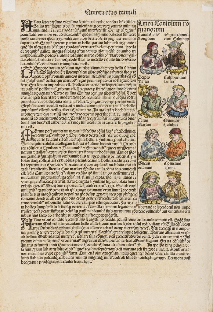 S. 85 (verso und recto) des Teils "Quinta etas mundi" (5. Weltalter) aus Hartmann Schedels berühmter Weltchronik in lateinischer Sprache - die im Jahr 1493 in Nürnberg erschienene illustrierte Darstellung der Weltgeschichte vom Anbeginn der Welt bis 1492/1493. Die Unterteilung erfolgte in 7 Weltalter nach Tradition mittelalterlicher Chroniken. Das 656 Seiten umfassende Werk enthält mehr als 1800 Holzschnitte aus der Nürnberger Werkstatt von Michael Wolgemut (1434 - 1519). Etwas stockfleckig, Ränder griff- und knickspurig.