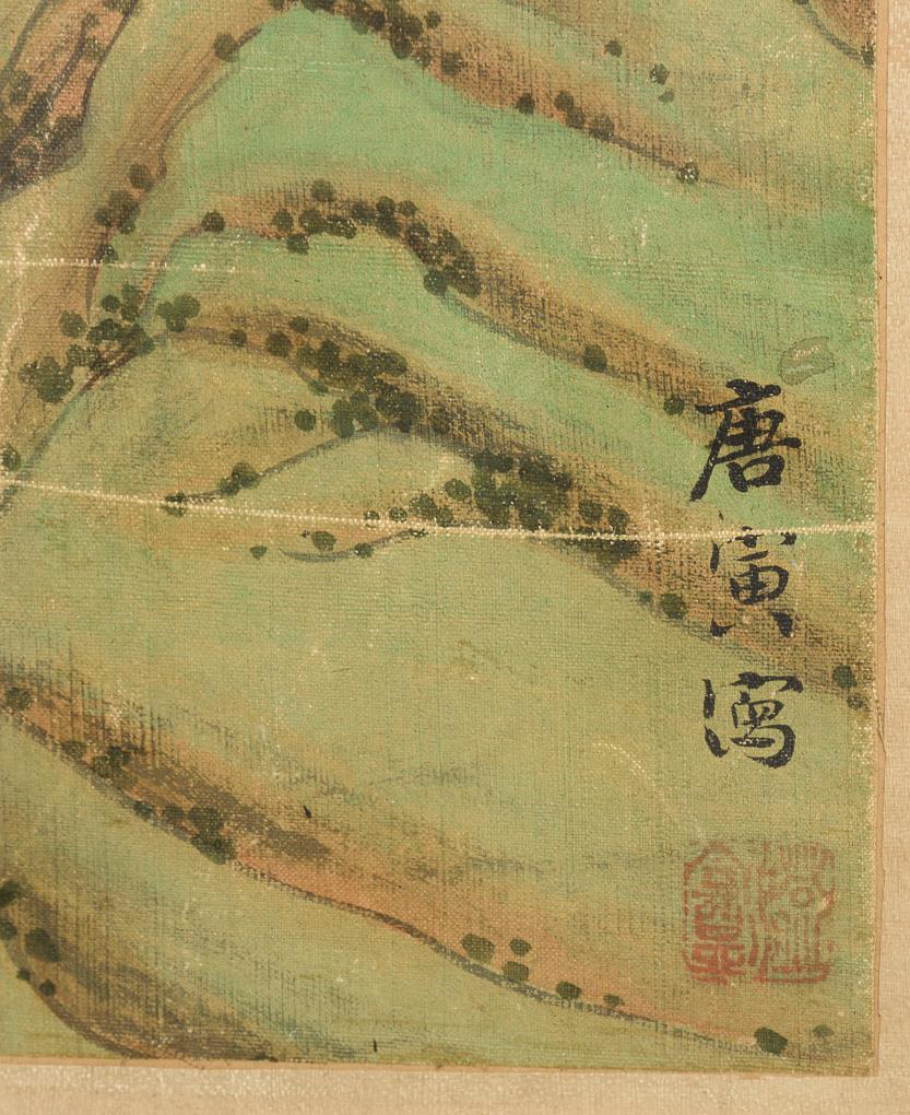 Darstellung verschiedener Jagdarten; mongolischer Reiter. Landschaft entwickelt sich vom See, über Berge mit blühenden Bäumen, zum angedeuteten Hochgebirge. Im Hintergrund die Kuppeln zweier Jurten. Eventuell früher als Rollbild verwendet. Rechts oben zwei Wasserflecken, Altersspuren mit stellenweise beriebener Malschicht.