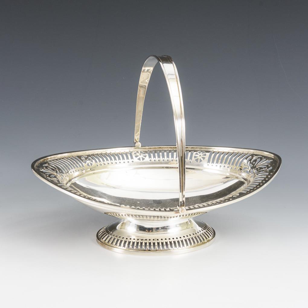 Anbietschale mit durchbrochen gearbeitetem Rand und Scharnierhenkel. Auf ovalem Fuß. Minimale Gebrauchsspuren.