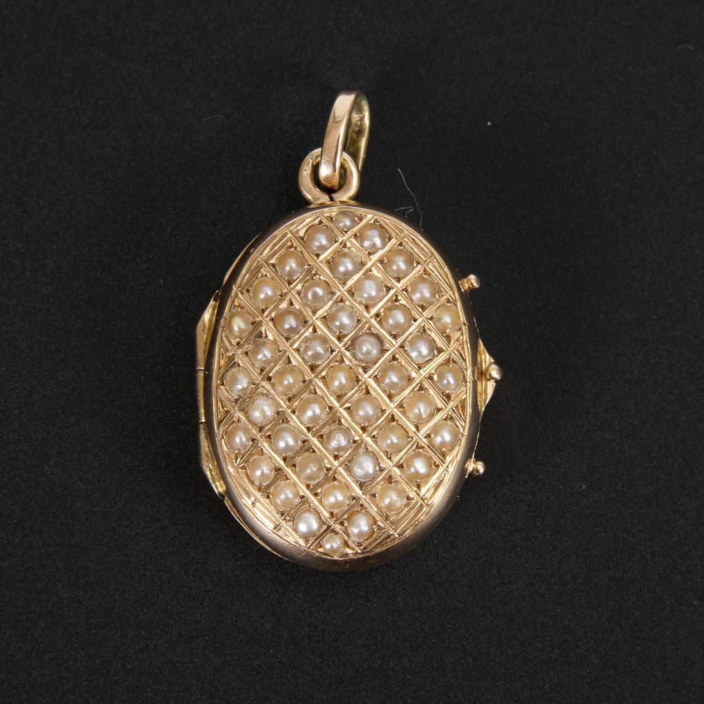 Medaillon mit schauseitigem Perlchenbesatz und rückseitig floraler Gravur. Verglast gerahmte Innenfächer.