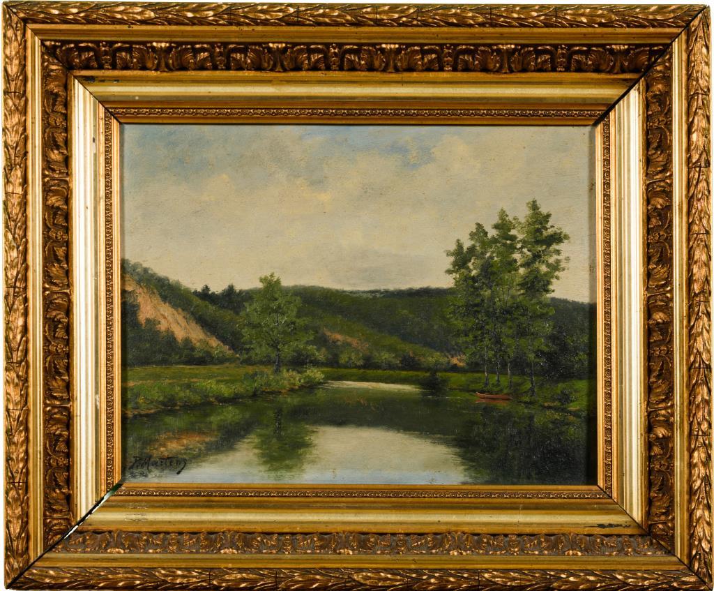 Flusslauf mit Kahn in bergiger Sommerlandschaft.