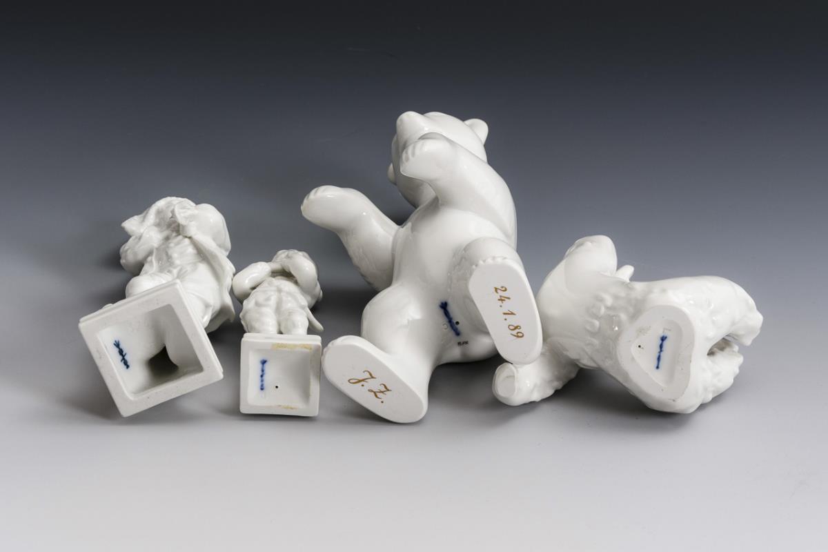 Stehender Bär im Originalkarton (Bär unterseitig monogrammiert und datiert "J. Z. 24. 1. 89"; H 19 cm), Knabe mit Schlittschuhen als Allegorie des Winters (H 16 cm), sitzender Bär (H 11 cm) und Sternzeichenfigur Wassermann (H 11,5 cm).