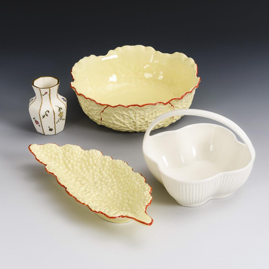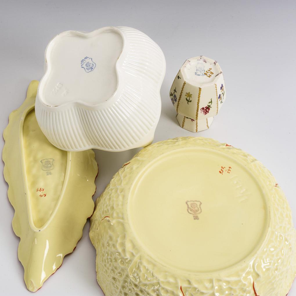 Weiße 4-passige Henkelschale mit gerillter Wandung, ca. 1914-1926, H 12 cm. Kleine Balustervase mit achtfach geplatteter Wandung, farb- und goldstaffiert, 1926-1928, H 8 cm. 2 gelbe Blattreliefschalen mit roten Rändern, 1930er Jahre, L 25 cm, Ø 21 cm. Partiell leichte Gebrauchsspuren.