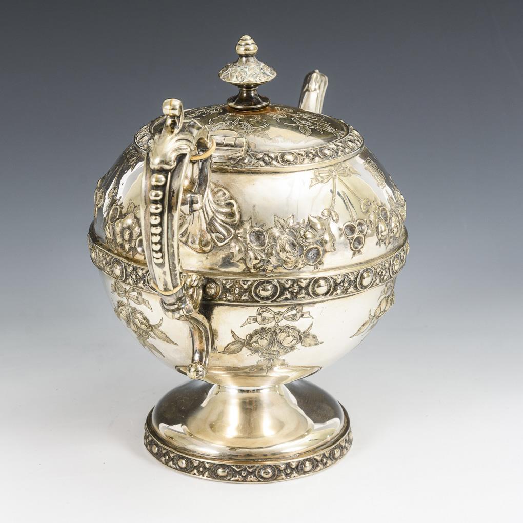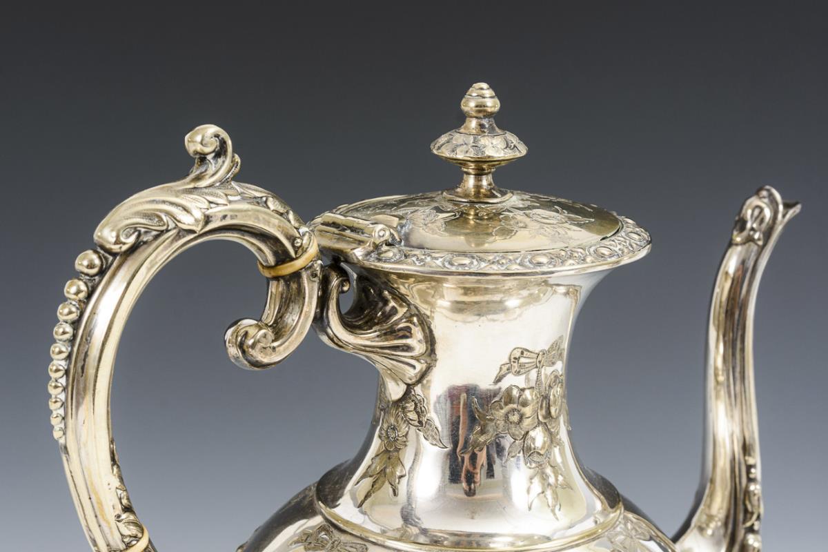 Gebauchte Form mit reliefierten Blütengirlanden und Monogrammgravur "FEB": Kaffeekanne, Teekanne, Zuckergefäß und Sahnegießer. Leichte Alters- und Gebrauchsspuren.