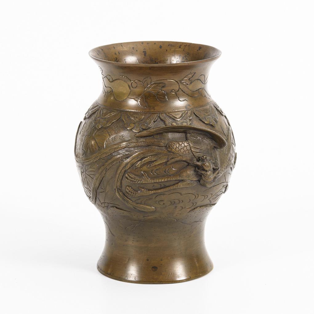 Balustervase mit weit geöffnetem Hals. Zwei reliefierte, fliegende Phönixe auf Wandung.