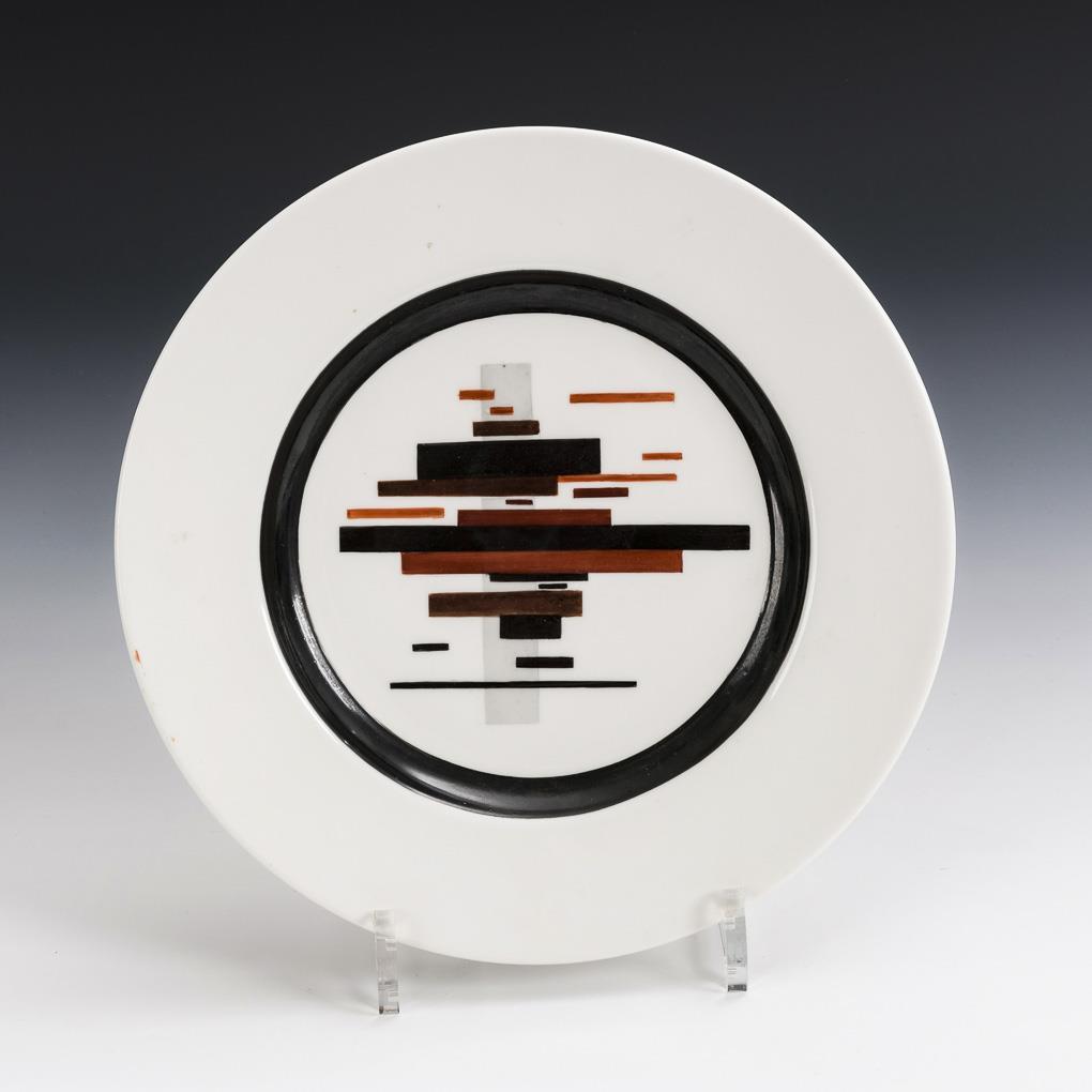 Suprematistischer Teller mit geometrischem Balken-/Streifendekor in Schwarz, Rot, Braun und Grau.