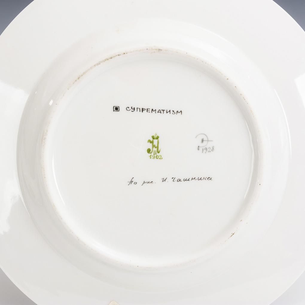 Gemalte Marke Nikolaus II. /St. Petersburg 1902 und Hammer-/Sichelmarke 1928, kyrillische Bezeichnung "Suprematism". Russland. Kyrillisch signiert "po rus. I. Tschaschnika" (= Ilja Grigorjewitsch Tschaschnik, 1902-1929).
