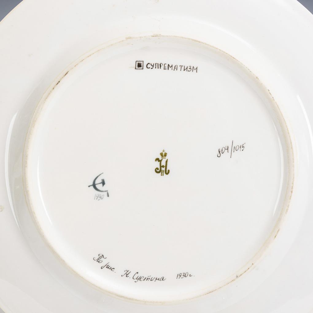 Gemalte Marke Nikolaus II. /St. Petersburg (undatiert) und Hammer-/Sichelmarke 1930, kyrillische Bezeichnung "Suprematism". Russland. Kyrillisch signiert und datiert "po rus. I. Suetina 1930" (= Nikolai Michailowitsch Suetin, 1897-1954).