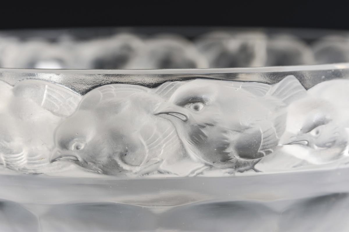 Facettierte Schale mit einem umlaufenden Reliefdekor mit jungen Meisen.