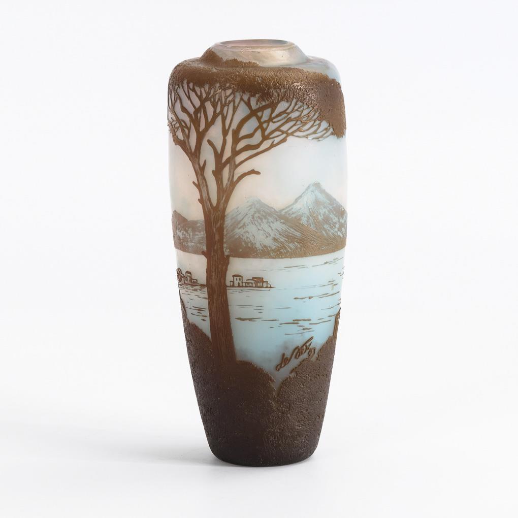 Balustervase mit der umlaufend geätzten Darstellung einer alpinen Seelandschaft. Kleine Bestoßung am Mündungsrand.
