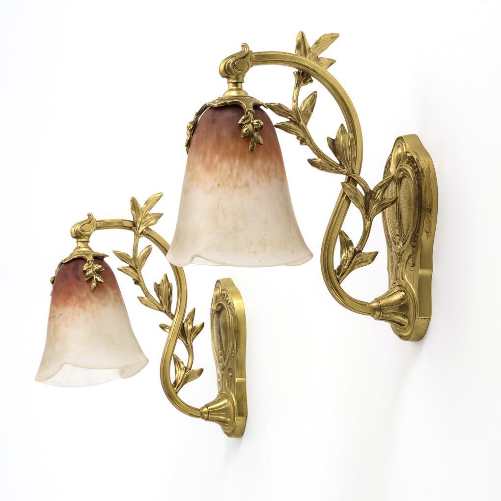 Glockenschirm, am Rand vierfach gekniffen (L 13,5 cm). An Wandhalterung aus Bronze mit gebogtem Leuchterarm, sich um den Arm windendem Lorbeerzweig und ornamental reliefierter Halterung.